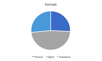 I read mostly digital books this year at 126 and then physical and audiobooks were pretty close at 68 and 70 respectively. I was really surprised to realize that I read so many audiobooks this year! Thank God for Hoopla, honestly. And my Audible Romance subscription.