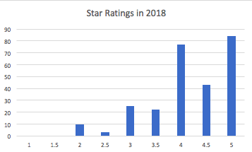 I read 84 5 star books this year and my lowest rated books were ten 2 star books. I feel like this was a pretty great reading year, honestly, and I’m proud of myself for being more honest about my ratings. I usually feel bad when I don’t rate a book at least 4 stars, so I feel like I’ve been more honest with myself this year about how I’m rating them. Including half stars has helped too!