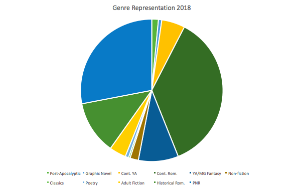 This chart is not the easiest to read because while I didn’t read a ton of books from several of these genres, I did read a lot of genres… So essentially, what this chart is telling you that’s important to me is that my most read genre this year was Contemporary Romance (96 books) followed by Paranormal Romance (74 books). The other two slightly big-ish chunks are for Historical Romance (32 books) and YA/MG Fantasy (24 books). I found this fascinating for myself because like… I’d never read much PNR before this year and then I just took off with it. And for historical romance to be so low? Just surprising.