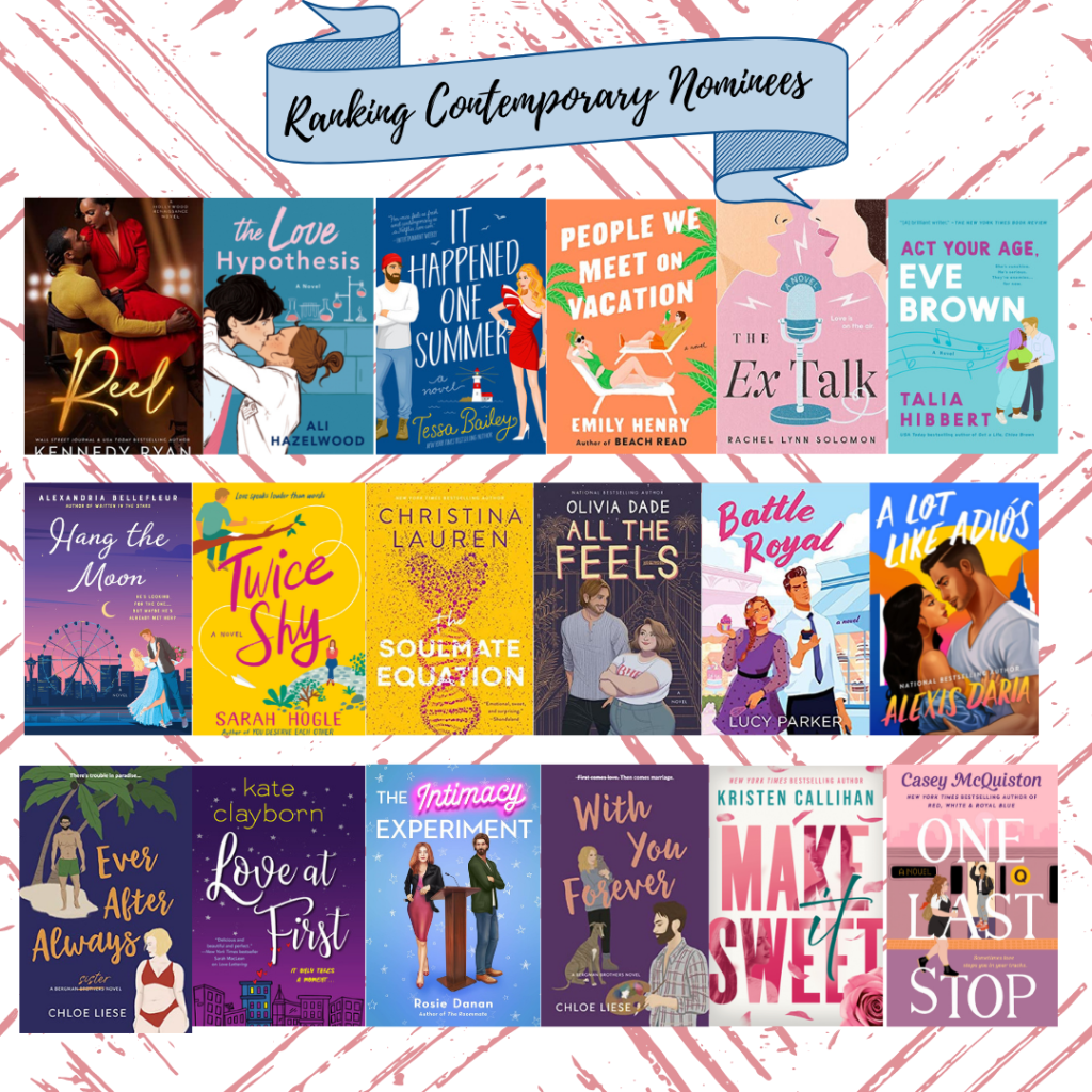 So, y’all already know I love The Swoon Awards as a concept if you were here for me complaining about the Goodreads Romance nominees and planning my contemporary nominees for The Swoon Awards nomination round. Therefore, I couldn’t help but come back to talk about my response to the semi-final contemporary nominees and my TBR. There are 30 nominees so that’s a lot! The way I’m going to talk about this is that essentially there will be three parts. First, my overall impression and the book that I wish more of y’all had read to nominate, then we’ll transition to a quick TBR, and finally, I’ll end with my current ranking of the books so we can see what five books I’ll be nominating if none of the TBR books knock one of the top five down the list! So, let’s get started.