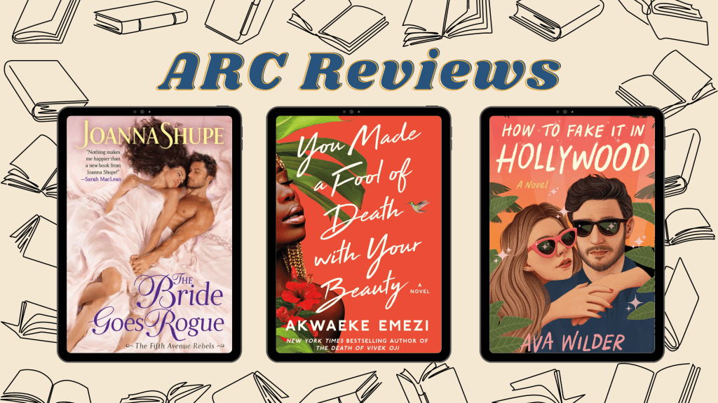 Now for the books that I have to review for you today. First up, we have The Bride Goes Rogue by Joanna Shupe, which is out from Avon as of Tuesday. I received this book as an e-ARC from Netgalley. Then we have You Made a Fool of Death with Your Beauty by Akwaeke Emezi, out from Atria Books on Tuesday. I received this book as an e-ARC from Netgalley, but I purchased an audiobook copy from Libro.fm because Bahni Turpin was the narrator and it was a truly excellent choice. Then finally, we have How to Fake It in Hollywood by Ava Wilder, her debut, I believe, and it’s out from Dell on June 14th. I received this book as an e-ARC from Netgalley. And, if you’re wondering if I had other books that are out in May that you haven’t seen reviews for yet, well, yes. I do. But hopefully you’ll have them next week. For now, let’s talk about these three, shall we?