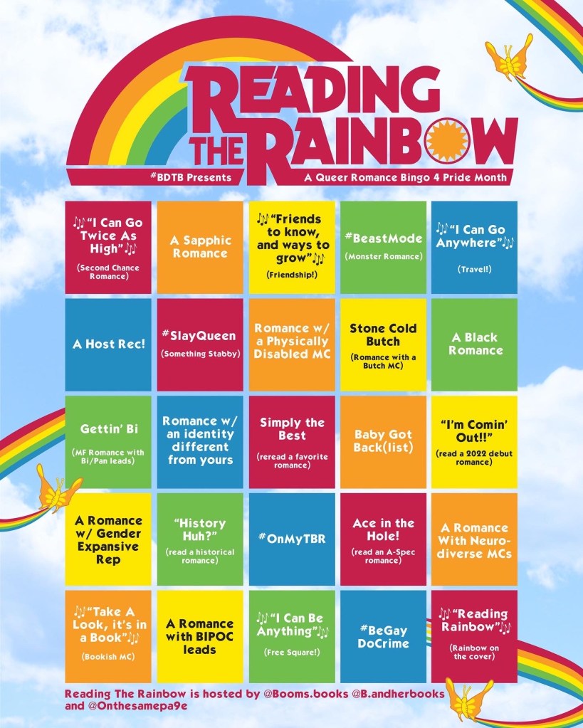 Row Five: “Take a Look, it’s in a Book” (Bookish MC), A Romance with BIPOC Leads, “I Can Be Anything” (Free Square), #BeGayDoCrime, and “Reading Rainbow” (Rainbow on the Cover)