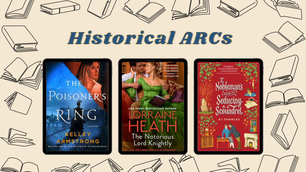I’m really delighted to be able to give you some ARC reviews, even if they are largely months late. Oops. The Poisoner’s Ring by Kelley Armstrong is the second book in a historical mystery series that I am really addicted to at the moment. The Notorious Lord Knightly is book two in The Chessmen series from Lorraine Heath and is a historical romance. And then finally, I have a review A Nobleman’s Guide to Seducing a Scoundrel by K.J. Charles, which I just finished listening to today! So, nothing like being a little delayed in getting these reviews out to y’all. Thanks so much to Netgalley and the publishers for the advanced copies.