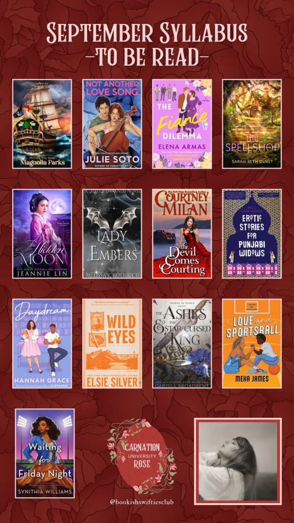 I’m also participating in the September Readathon hosted by Bookish Swifties Club and I’m now enrolled in Carnation Rose University located on Maroon Isle studying Women’s Lit and Metaphors. So, basically, I’m obsessed. Thankfully, there are 90 prompts initially and then we’ll unlock more so basically I plan to read the above six books and then several others. But I’m not too stressed about specifically what I’m reading. Here’s the TBR I shared to Instagram though: