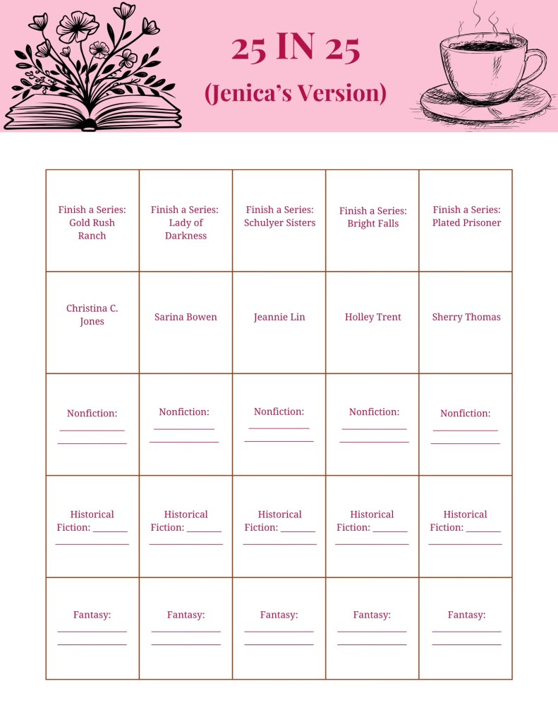 The realization that 25 in 25 means a 5 x 5 bingo board works perfectly delighted me so much that I decided I absolutely had to make my own bingo board. This bingo board is absolutely personal to me, but I will explain my thought process behind it, in case it’s something that you want to adapt to work for you. I decided on five categories of books that I want to tackle, which you’ll see as we go through this board.